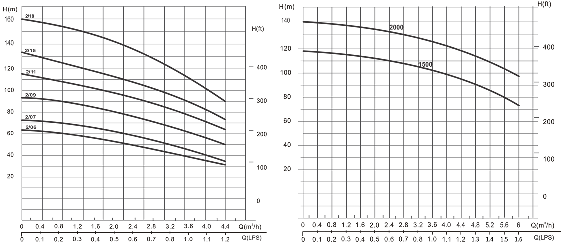 | Model | kW | HP | Pump Size (mm) | m³/h | 0 | 1 | 2 | 3 | 4 | 5 | 6 |
